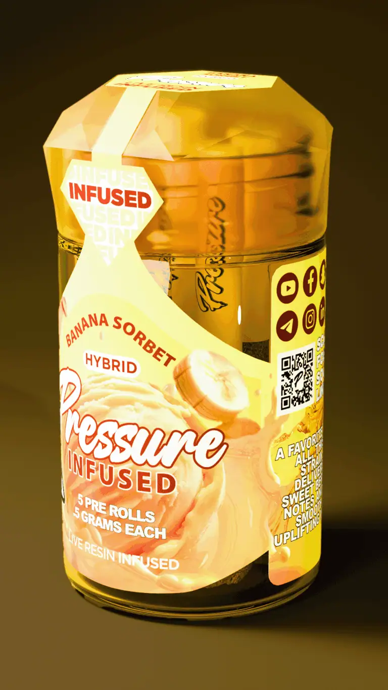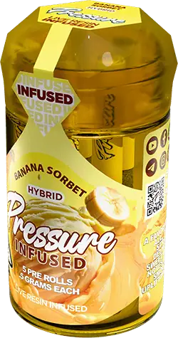Pressure Banana Sorbet 2.5G Live Resin Infused THC Prerolls – Hybrid are crafted for consumers who value quality, performance, and taste. From the sweet banana terpene profile to the balanced hybrid effects and convenient 2.5G multi-pack design, this product delivers a smooth, flavorful, and elevated preroll experience.