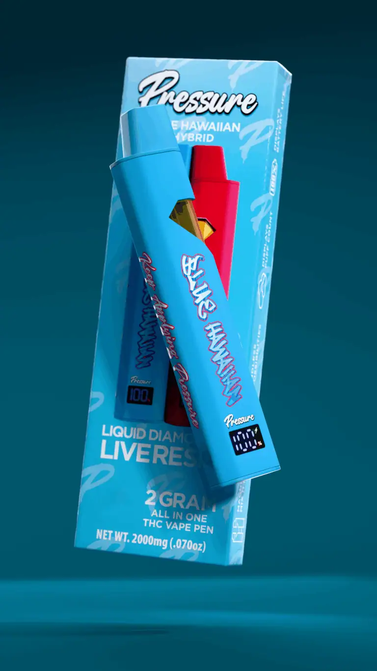 This Pressure disposable vape combines liquid diamonds and live resin to maximize potency and preserve terpenes. Liquid diamonds provide high THC concentration and clean vapor production. Live resin maintains the natural flavor compounds of the Blue Hawaiian strain, delivering a smooth and flavorful experience.
