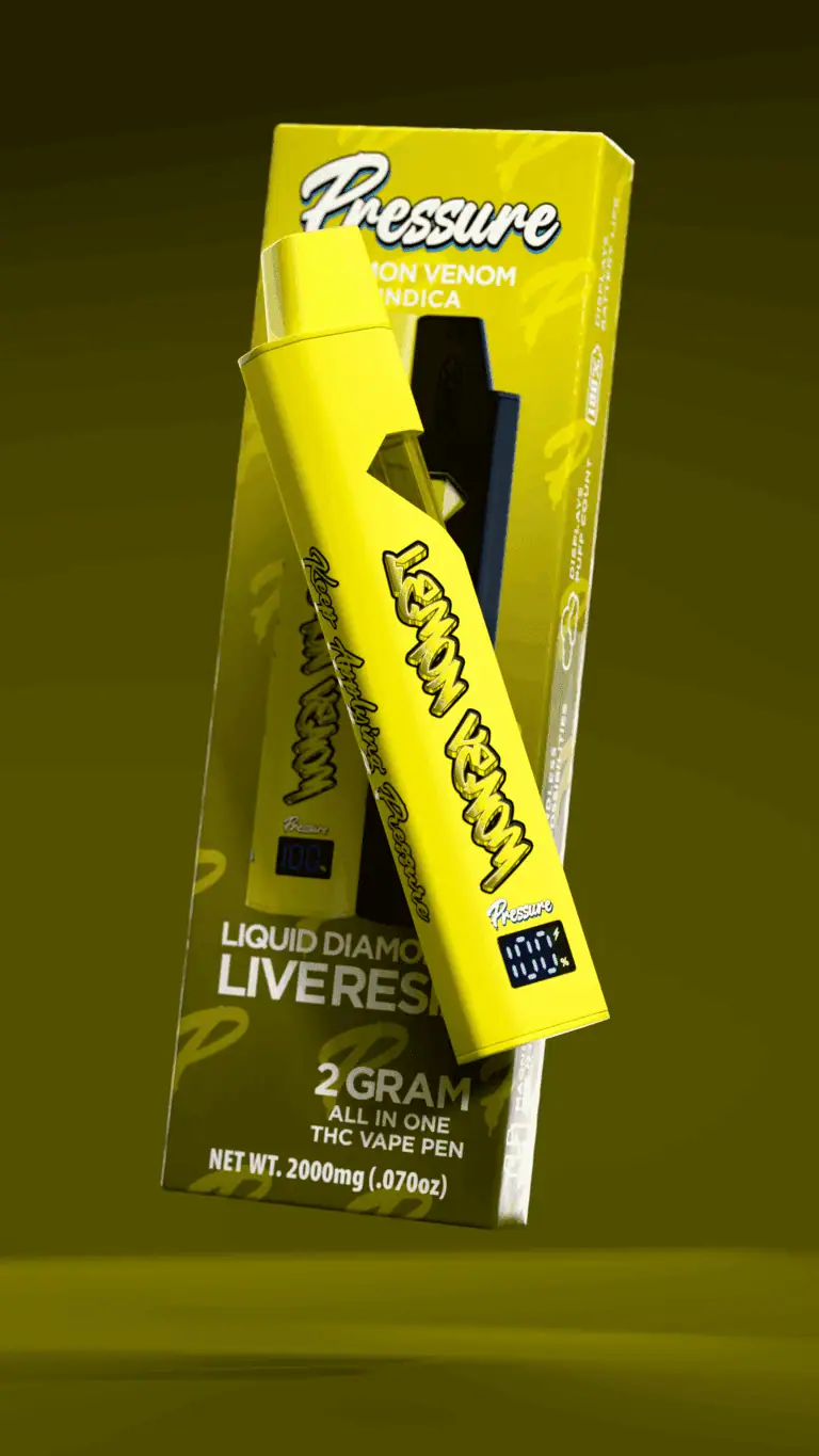 The Pressure Lemon Venom disposable vape combines liquid diamonds with live resin to create a powerful cannabis concentrate. Liquid diamonds provide a highly refined and potent THC base. Live resin preserves the natural terpenes from freshly harvested cannabis plants. Together, they produce smooth vapor with strong and consistent effects.