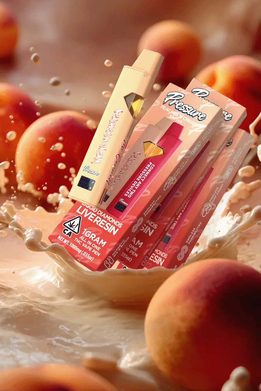 The Pressure Peaches N Cream disposable vape combines liquid diamonds with live resin to create a smooth and flavorful cannabis concentrate. Liquid diamonds provide a refined THC base with reliable potency. Live resin preserves the natural terpenes from freshly harvested cannabis plants, enhancing flavor and aroma.