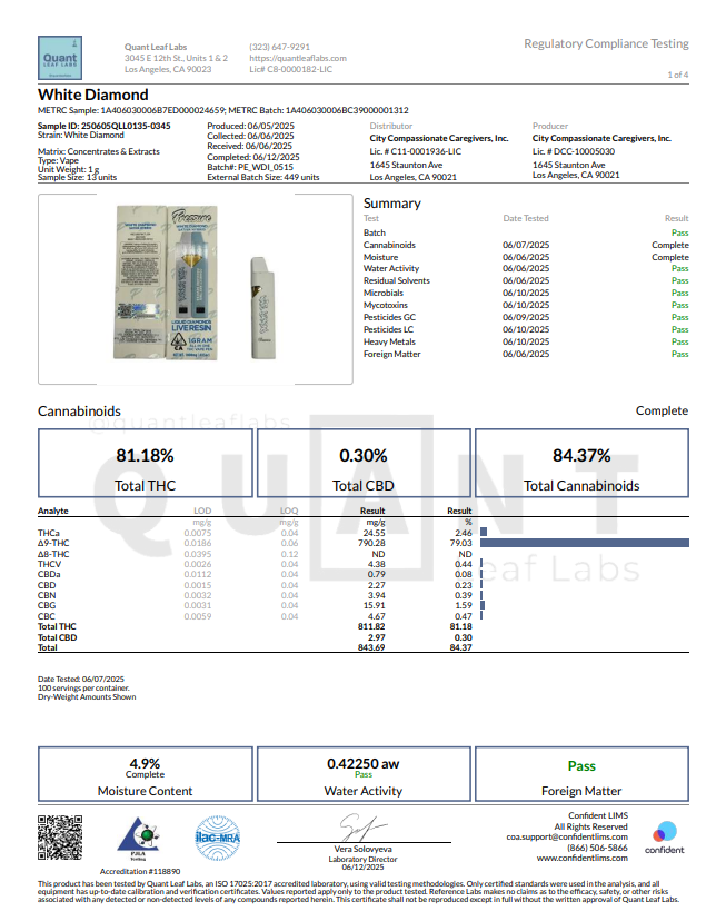 This Pressure Disposable White Diamond 1G vape features a powerful combination of liquid diamonds and live resin, testing at 81.18% THC. Liquid diamonds contain concentrated crystals that enhance potency and provide long‑lasting effects. Live resin preserves the plant’s original terpene profile, delivering authentic aroma and flavor with every puff.