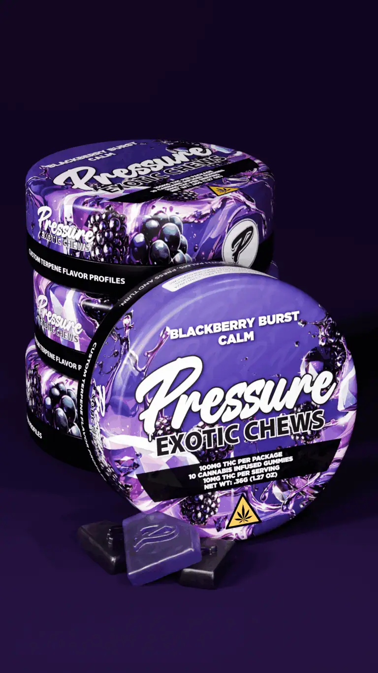 Pressure Exotic Chews Blackberry Burst Calm 100MG THC Infused Edibles deliver rich blackberry flavor, precise dosing, and soothing, long-lasting effects in a premium cannabis gummy format. Designed for consumers who want relaxation and consistent potency, these THC infused chews combine sweet, tart blackberry taste with a calm-focused effect profile in every bite.